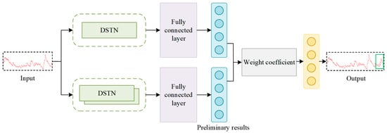 A novel cloud computing load prediction method has been proposed, the Double-channel residual Self-attention Temporal convolutional Network with Weight adaptive updating (DSTNW). A Double-channel Temporal convolutional Network (DTN) has been adopted to improve prediction accuracy and better capture long-term dependencies in the sequence. A residual temporal Self-attention Mechanism (SM) has been adopted to add the contribution of historical data to jumps in the process [,,]. DTN and SM jointly constitute a dual-channel residual self-attention temporal convolutional network (DSTN). In addition, by evaluating the accuracy aspects of single and stacked DSTNs, an adaptive weight strategy has been developed to assign corresponding weights for single and stacked DSTNs, respectively.