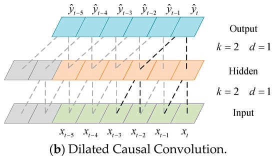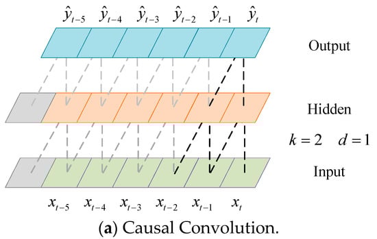 The convolution operation is represented by a dashed line in Figure 3. The green represents the input, blue represents the output, and orange represents the hidden layer. The predicted load sequence ŷt is calculated from the input sequence [xt−2, xt−1, xt], and has nothing to do with the input sequence [xt+1, xt+2, …]. The application of causal convolution in the TCN [] would not cause information leakage. Since the receptive field is small for the causal convolution in the TCN [], the DCC is developed by increasing the expansion coefficient to expand the network receptive field as shown in Figure 3a. It can be seen from Figure 3 that the receptive field of the DCC under the same number of layers is expanded to 4.