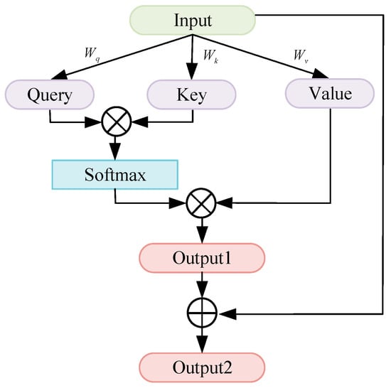 A self-attention layer is the core component of a self-attention mechanism as shown in Figure 4. The symbol represents the addition of two values and the symbol represents the multiplication of two values. It comprises three elements including queries, keys, and values. These three vectors are obtained by multiplying the input data with the corresponding weight matrices Wq, Wk, and Wv, respectively: