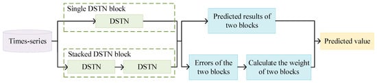 The input is passed through the single and stacked DSTNs, respectively. Some weight coefficients are obtained by the adaptive weight update strategy. The predicted results are provided in the output.