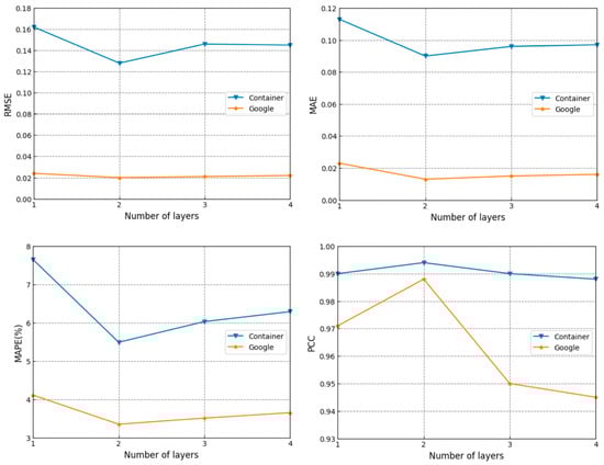 To obtain the best predicted performance, it is necessary to determine the optimal number of layers for the DSTNW. A single and a stacked DSTNs, together as shown in Figure 5, were taken as one network layer. The number of layers changed from one to four with an interval of one. Some experimental results for different layers are given in Figure 6.