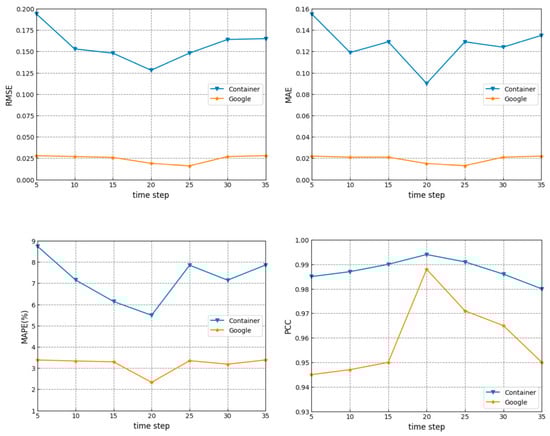 One can find from Table 2 that the proposed method exhibits the best performance among the selected methods ARIMA [], LSTM [], and TCN []. Compared with these comparative models, the algorithm we propose has better prediction performance and higher prediction accuracy. The experimental results show that on the Container dataset and the Google dataset, our model has smaller errors in the indicators of RMSE, MAE, and MAPE, and performs better for the PCC indicator. The reason is as follows. ARIMA [] is a linear model in essence, while the cloud load prediction sequence has nonlinear characteristics. LSTM [] performs poorly in extracting shallow information and is prone to encountering the gradient disappearance problem. This makes it difficult to predict accurately. TCN [] demonstrates better performance in handling long-term dependencies and has certain advantages in improving generalization and scalability.