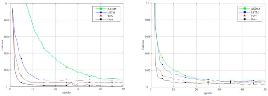 Compared with the TCN, the DTN uses dual channels instead of single channels, and the model becomes more complex. Although the model has more calculation steps, the parameter numbers do not increase during the training process of the model. This is why although the computational complexity increases, the training time of the network is only slightly longer. After adding the SM to the DTN, although there is an increase in parameter numbers, the SM module can help the model pay attention to more important features in the sequence, which also makes the training time of the DSTM network not increase, or even decrease. An adaptive weight strategy was adopted in the DSTNW network. This strategy includes the need to train the single and stacked DSTN, as well as weight1 and weight2, which increases the computational complexity, and its training time is also significantly longer.