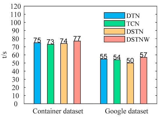 In order to test the complexity and training time of the proposed approach, a comparative experiment was conducted on the training time of the DSTNW, DSTN, DTN and TCN models. As shown in Figure 8, the experiments used the Container dataset and the Google dataset. The Container dataset and Google dataset used more than 7000 and 5600 datapoints, respectively, for the experiments. The training time was collected and calculated from the beginning of training to the generation of the results. All experimental data were performed with five-fold cross validation. The t/s values in the figure represent time/second.