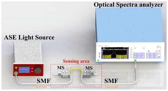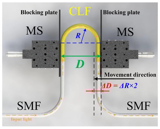 The schematic diagram of the U-shaped fiber structure is shown in Figure 1. The curved part in the middle is a segment of coreless fiber (CLF) with a diameter of 125 (YOFC (Wuhan, Hubei, China), CL-0/125). Both ends of the CLF are spliced with a piece of single-mode fiber (SMF, Corning Inc. (Corning, NY, USA) SMF-28e). The length of CLF is 5 . The bent coreless fiber (BCLF) is carefully spliced with the SMF to achieve the SMS structure. The coating layers of the BCLF are retained to reduce the transmission loss of the structure, except for approximately 5 near the spliced point at both ends. The multimode coreless fiber cladding material is solid quartz, and the coating layer is acrylic resin. The refractive indices of the cladding and coating are 1.495 and 1.482, respectively. The numerical aperture of the multimode fiber is 0.197. The structure is placed between two micro-stages (MS) with blocking plates fixed inside. One of them is fixed, and the other can be adjusted to fine-tune the parallel spacing (marked as D, D is the bending diameter). The ends of the multimode BCLF are securely anchored at the lower extremity of these blocking plates to ensure they remain at the same horizontal level and maintained straight near their fixed location. The radius of the U-shaped fiber structure is marked as R in Figure 1. The length of the BCLF exceeds the arc length corresponding to the parallel spacing to ensure the BCLF consistently maintains a stable U-shaped bending with a designated radius R and the symmetry of the structure. When the right MS moves a micro-displacement to the left, the change in bent radius is , and there is = . The experimental setup is illustrated in Figure 2. The bandwidth of the ASE light source is 50 nm, and the wavelength range is from 1520 to 1570 nm. This band is located in the lowest loss window of quartz fiber. The transmitted spectra are recorded by an optical spectrum analyzer (YOKOGAWA (Tokyo, Japan), AQ6370D).