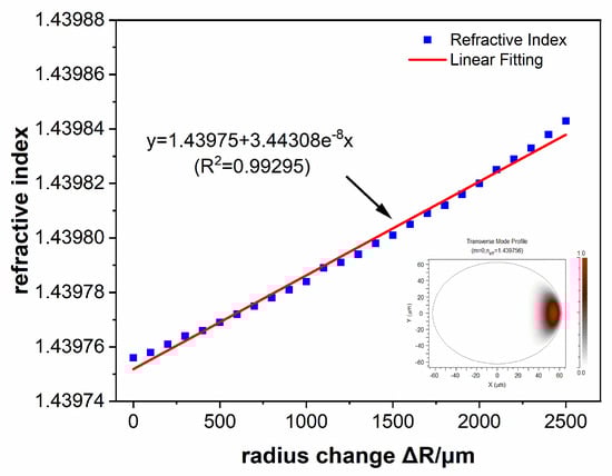 The spectral characteristics of the U-shaped SMS fiber structure can be simulated by the beam propagation method (BPM). The simulation results of the changing with the change of the bent radius R are shown in Figure 3. Bending causes the transverse mold in multimode fibers to shift towards the side of the bent radius. The distribution of the fundamental mode in a bent segment is shown in the insertion of Figure 3. As the amount of variation in the bending radius increases, the equivalent refractive index increases. The simulation results of displacement within the range of 5 are shown in Figure 4. The typical marked dip or peak in the transmission spectrum has a regular red shift with the increase in displacement . The sensing information of displacement can be obtained by recording its central wavelength. There is a positive linear relationship between the absolute value of and when the displacement bending radius decreases, which is shown in Figure 4. Conversely, the absolute value of is negatively correlated with as R increases. Linear data fitting and the least squares are methods used to determine linear dependencies. The results of the theoretical calculations agree with the simulation trends. There is a positive linear relationship between and .