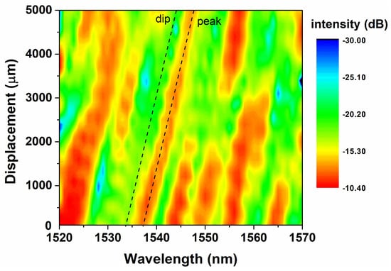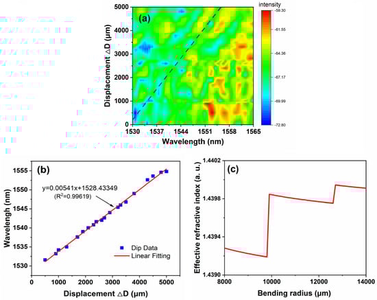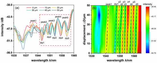 The spectral shift properties are recorded in a small displacement range of 50 . The comparison of the spectra is plotted in Figure 5a, and the evolution of 2D spectral intensity with displacement is shown in Figure 5b. There are many obvious peaks and dips in the output spectrum because of the multimode interference effect, which are, respectively, marked in the figure. Moreover, the loss fluctuation phenomenon is not obvious due to the small range of bent radius variation. The intensity of the spectrum remains almost the same. As the displacement increases, the overall spectrum has a regular movement toward longer wavelengths with the equivalent refractive index becomes larger (as shown in Figure 5a). The experimental results are in agreement with the trend of the results calculated by the coupled theory of (1) and (2).
