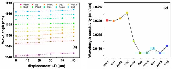 According to the movement of characteristic peaks and dips, the sensing relationship between their corresponding wavelengths and displacements is recorded as shown in Figure 6. Linear dependencies are determined using linear data fitting and least squares. The measurement results show that there is a linear relationship between the wavelength drift and the displacement. The sensitivity is calculated and plotted in Figure 6b. The maximum sensitivity of displacement is P2 (marked as peak2), with its initial center wavelength of 1548.13 . The sensitivity of its displacement sensing is 34.46 , with a minimum displacement change of approximately 5.804 . The sensitivity is reduced to 16.6 when the central wavelength of marked peaks or dips increases to 1559 . This is due to the difference in the number of modes in multimode fibers. Compared to lasers with larger central wavelengths, short-wavelength light excites more modes and is more sensitive to refractive index changes caused by bending.