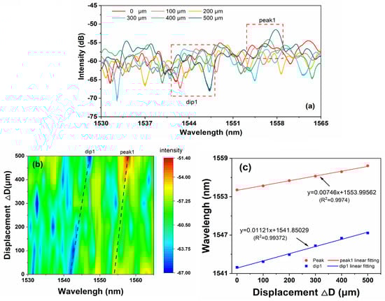 The output spectra with displacement variation are shown in Figure 7 when the length of BCLF is 5 cm. As shown in Figure 7a, when the displacement variation increased from 100 to 500 , the center wavelength of D1 (marked as dip1) drifted by 5.3 , from 1541.74 to 1547.04 , which is larger than that of P1 (marked as peak1). The wavelength of characteristic peak1 changes only 3.28 according to the 2D spectral intensity comparison in Figure 7b. The maximum sensitivity of displacement in 500 range is 11.21 . As shown in Figure 7c, light with longer wavelengths still has relatively low displacement sensitivity, similar to small-range situations. Meanwhile, the irregular changes in bending loss caused by changes in bent radius result in a significant decrease in displacement sensitivity compared to small-scale situations.