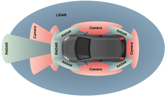 In order to reach higher SAE levels and accomplish the goal of fully autonomous navigation, a comprehensive perception of the environment is mandatory, which is only possible through the use of multi-sensor configurations [6]. Figure 1 depicts a modern vehicle’s perception system, which includes cameras, Radio Detection and Ranging (RADAR) devices, and LiDAR sensors, among other possible sensor technologies and configurations.