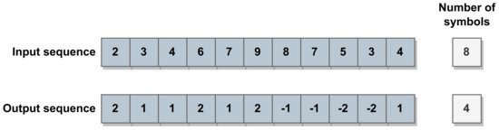 Dictionary-based methods identify and store recurring structures within the input data, making them especially efficient when data includes substantial pattern repetition. When an input data sequence aligns with a pattern already stored in the dictionary, only the offset, the length, and a pointer to the matched pattern are coded in the final bitstream, reducing the final data size. Thus, the number of matches and the match length directly influence the overall compression ratio. Nonetheless, each dataset has a unique dictionary, which must be stored alongside the compressed data to allow the decoding step. The work by Maksymova et al. [45] suggests the utilization of the Lempel–Ziv–Markov chain algorithm (LZMA) with LiDAR data. The LZMA is a lossless dictionary-based compression approach that uses the LZ77 algorithm [52] and can be used in different applications that require both the streaming and storage of LiDAR data. This algorithm comprises three stages: (1) delta encoding; (2) sliding dictionary encoding; and (3) range encoding. In the delta encoding stage, a symbol is replaced by the difference between its value and a reference value. As depicted in Figure 4, this state tends to increase the efficiency of the resulting sliding dictionary since it reduces the number of distinct symbols in a sequence. Next, the sliding dictionary applies the LZ77 algorithm, utilizing a search buffer with a defined range to identify patterns in preceding data. It outputs the offset to the matched data, the length of the match, and the next input symbol. The final stage involves the range encoder [53], an entropy encoding method based on the arithmetic encoder [50].