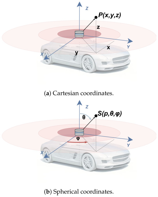Compression algorithms based on 2D representations focus on compressing images that represent point clouds. First, the 3D point cloud is converted into a 2D structure, which stores either points represented by the Cartesian coordinates system or the spherical coordinates system , as illustrated in Figure 5.
