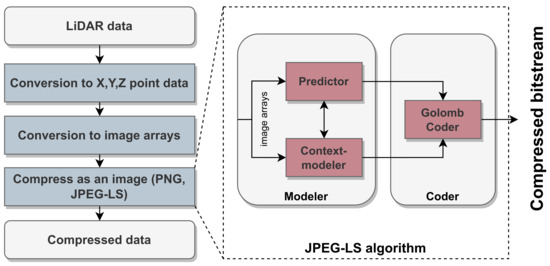 The JPEG 2000 [60] improves the original standard using a discrete wavelet transform (DWT) step instead of a DCT, which increases the overall compression ratios. It also provides lossy and lossless compression flexibility according to the application’s needs. Regarding the JPEG-LS [61], which is derived from the Low Complexity Lossless Compression for Images (LOCO-I) algorithm [62], it provides a simple, yet efficient, implementation. JPEG-LS consists of two basic steps: the first step involves a context-modeler and a predictor that estimates the pixel values based on their surroundings. The following step applies a Golomb–Rice encoder to compress these predictions efficiently. Figure 7 depicts the encoding steps of image-based algorithms to compress point cloud data.