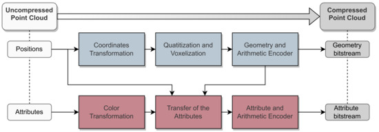 - Kammerl, J.; Blodow, N.; Rusu, R.B.; Gedikli, S.; Beetz, M.; Steinbach, E. Real-time compression of point cloud streams. In Proceedings of the 2012 IEEE International Conference on Robotics and Automation, St Paul, MN, USA, 14–18 May 2012; pp. 778–785. [Google Scholar] [CrossRef]