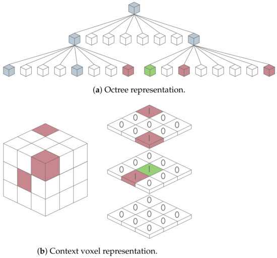 - Que, Z.; Lu, G.; Xu, D. VoxelContext-Net: An Octree based Framework for Point Cloud Compression. In Proceedings of the 2021 IEEE/CVF Conference on Computer Vision and Pattern Recognition (CVPR), Virtual, 19–25 June 2021; pp. 6038–6047. [Google Scholar] [CrossRef]