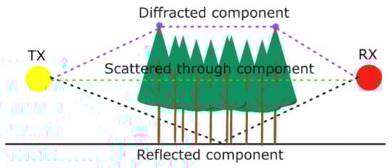 The radiative transfer equation can be considered with the assumption that the entire signal is transferred through the foliage with its absorption and emission as stated in Equation (10). However, as depicted above, the incoherent component may cause a change in direction, and the signal may go out from the trees with a randomized direction, unlike the coherent component. Then, as shown in Figure 3, diffracted or reflected components may emerge.