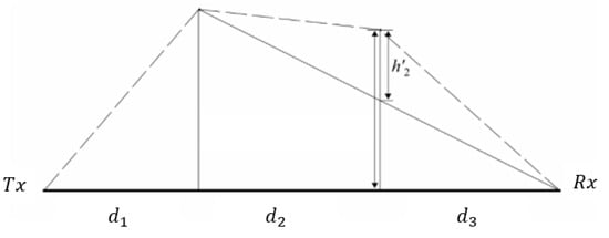 where , and are specific distances given in Figure 4. In addition, the parameter in Figure 4 is the height of the obstruction above the line of sight of the signal diffracted from the highest obstruction.