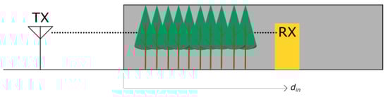 Foliage attenuation can be calculated with the exponential model with maximum attenuation, known as the MA model [11,17]. In that model, the distance is the distance in a homogeneous environment, as presented in Figure 5. The foliage is assumed to be homogeneous from the edge of the forest to the point of the receiving antenna. Then, the excess foliage loss is given as