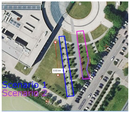 Satellite view of the area with considered measurement scenarios. Rectangular areas with trees for two scenarios are marked in two colors. Furthermore, next to Scenario 1, there is a line of length as the scale.
