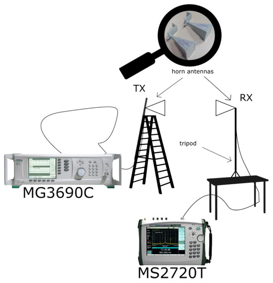 The measurement equipment connection was as follows (Figure 7): Continuous wave (CW) was generated by an Anritsu MG3690C at frequency . The transmitted power was . The signal was received by an Anritsu MS2720T spectrum analyzer. The noise floor during the measurement was , and the dynamic range was at least in resolution bandwidth (RBW).