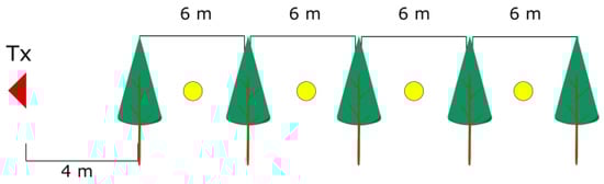 The illustration of the measurement scenario is shown in Figure 8. The Tx position for all measurements was constant, away from the first tree in the row. Then, the Rx position during the measurements was placed in different free-space points between trees.