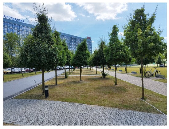 Measurements were carried out in the vicinity of the Poznan University of Technology Lecture Center. In Figure 6, the satellite view of the measurement scenario is shown. Before the building on the square, the trees are planted in a regular grid, with a precise distance of between consecutive trees in the row. Although six rows of trees can be found in the courtyard, two rows were selected for measurements and marked as Scenarios 1 and 2. The trees in all rows are homogeneous in terms of species. Furthermore, the distance between rows and consecutive trees is regular. The distance between rows is , while the distance between trees in a row is .