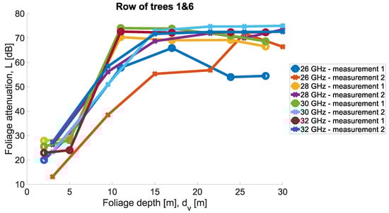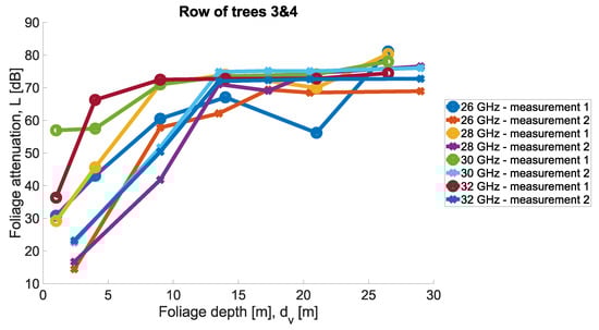 Measurements were conducted for Scenarios 1 and 2; for each Scenario, the other set of trees was taken into account. Then, in each scenario, the same set of trees was considered, but two directions of measurement were considered. Precisely, the transmit antenna was set in two variants at two ends of the tree row highlighted in the legend as ‘measurement 1’ and ‘measurement 2’. In Figure 11 and Figure 12, the results of the measurements are presented for the two scenarios for four carrier frequencies. Foliage attenuation is there presented in the function of foliage depth. Therefore, the point ‘zero’ at the depth of the foliage is the beginning of the first tree in the tree alley. In each measurement scenario, Tx was located 4 m away from the first tree corona, as presented in Figure 8.
