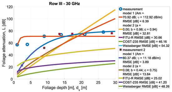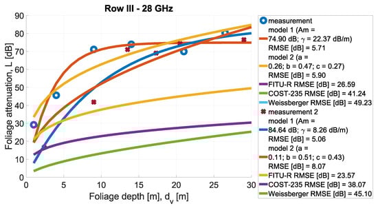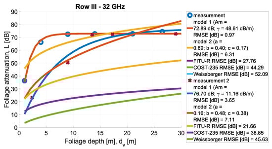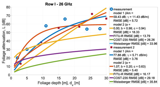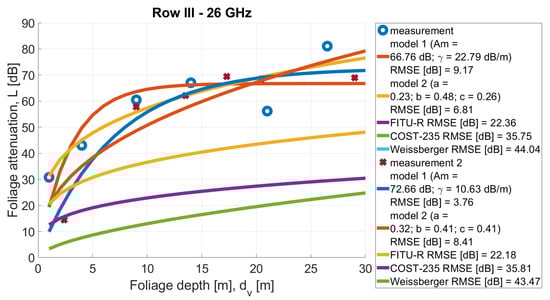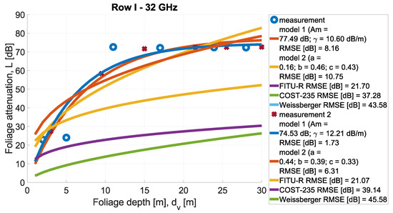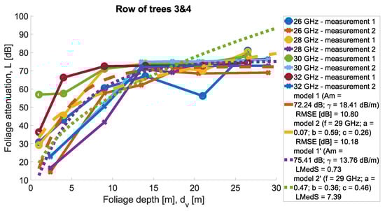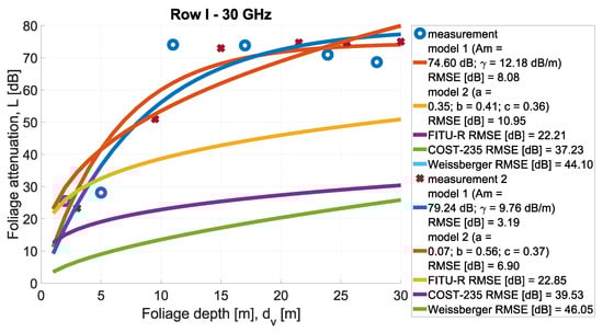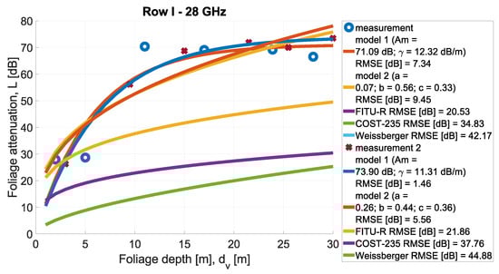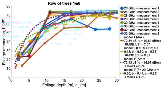 In Figure 13, Figure 14, Figure 15, Figure 16, Figure 17, Figure 18, Figure 19 and, Figure 20, the measurements are presented and divided by frequency and scenario. They are compared with three reference models (COST-235, Weissberger, and FITU-R) and two statistical models with tuned parameters, according to frequency. Maximum attenuation is presented as ‘Model 1’ and has and tuned, while MED, named in the figures as ‘Model 2’, has three parameters tuned. In addition, in the legend of each plot, the value of the root mean square error is given.