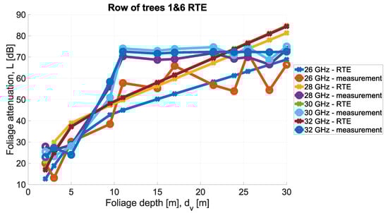 Other articles have investigated the effects of foliage in millimeter-wave bands. In [9,10], the examination focused on the frequency of . Two different measurement scenarios were prepared and investigated, one for the parallel orientation of the measurement link to the tree alley and the other for the skew orientation. After the analysis of the measurements, it was found that two types of components could be distinguished in the receiving signal: a well-defined directive component and extra diffusive components. Furthermore, the authors compared their results with various vegetative attenuation models, including the models in the document ITU-P.833. Based on the measurement points, the appropriate coefficients were tuned and derived. In [10], the seasonal variability of vegetation for the path loss measurements was verified. The measurements were carried out during December when leaves barely covered the trees and in October when the leaves were lush.