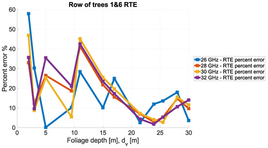 There are examples where foliage is an important factor to consider in mmWave links. First, dedicated software for predicting path loss in a foliage-dominant environment is described in [1]. It utilizes the empirical model P.1812 with a physics-based radiative energy transfer. Second, the prediction of UAV link coverage is characterized in simulation-based work [2]. The probability of coverage was shown to be reduced for 28 and by up to and , respectively, if the attenuation of foliage and rain is taken into account. Therefore, the attenuation of foliage is an important impairment that must be considered in modern systems. In addition, many measurement campaigns have been carried out in different frequency bandwidths [3,4,5,6,7].