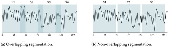 A critical issue arises when researchers seek to artificially increase dataset size by dividing each participant’s physiological data into multiple segments [18,41,42]. This practice violates the fundamental statistical assumption that observations must be independent since these resulting segments are interdependent due to being derived from the same participant. This can lead to data leakage, where dependent observations from the same participant are present in both the training and testing sets [24]. Furthermore, the use of overlapping window segmentation presents another potential source of dependency [31,43,44]. With this approach, observations not only come from the same participant but the physiological data themselves are partially shared across segments. Figure 1 illustrates an example of a 150 s HRV signal analyzed with a 50 s window size. This results in four segments with an overlapping approach (Figure 1a) and three segments with a non-overlapping approach (Figure 1b). For instance, a study investigating the detection of panic attack severity used overlapping windows on HRV data from 10 participants [45]. This approach generated a large number of observations (up to 1700 samples), substantially increasing the size of training and testing sets. A different study used overlapping windows with a 0.25 s shift on physiological data from 15 participants [31]. To address potential data leakage concerns arising from the segmentation process, they employed a subject-independent validation strategy.
