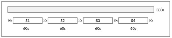 Non-overlapping segmentation of a 300 s HRV signal into 4 segments, using a window size of 60 s and a gap of 10 s between segments.