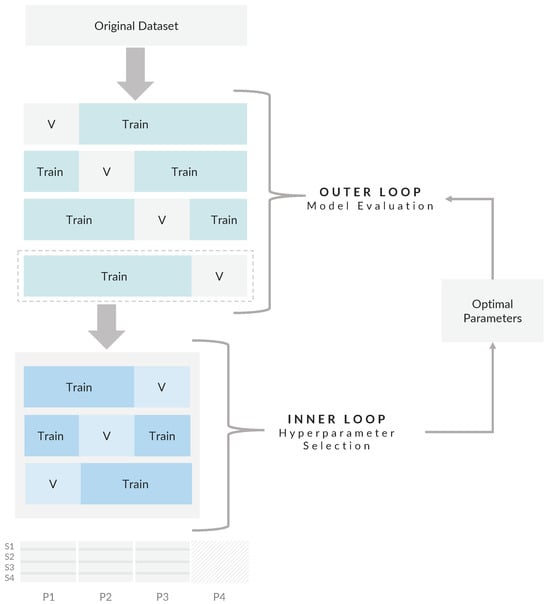 Model selection using the CV method is divided into two main steps: hyperparameter selection and performance evaluation. These steps are often assessed using the same validation/test set, potentially leading to biased performance estimates. Nested CV addresses this by incorporating two nested CV loops. The inner loop focuses on hyperparameter selection, while the outer loop is used for the performance evaluation. A specific CV method can be selected for each loop from a pool of available methods (e.g., K-fold, leave-one-out). As previously discussed, the leave-one-out method is recommended for limited datasets and dependent observations. In this study, the LOGO method was adopted to group associated segments based on participant ID [71]. LOGO is similar to leave-one-out, but it allows for the assignment of multiple observations to a single group. The total number of splits was equal to the total number of participants in the primary dataset (38), which corresponds to a 38-K-fold CV procedure.