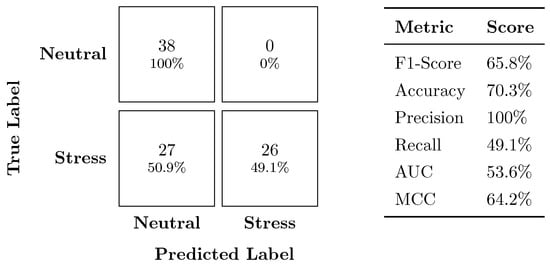 Figure 4 presents the confusion matrix with the corresponding performance metrics for the stress vs. neutral classifier on the secondary dataset. The model achieved a moderate F1-score of 65.8% and an accuracy of 70.3%. Notably, the model excelled at identifying all neutral instances (100% precision), but it had a lower recall rate for stress instances, misclassifying approximately half (49.1%).