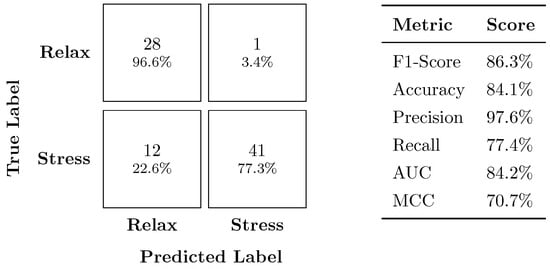 Confusion matrix and performance metrics for the stress vs. relax classifier.