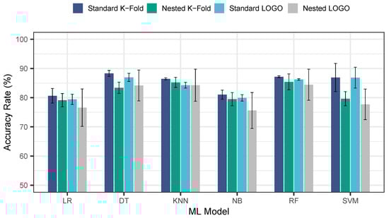 To evaluate the impact of the chosen validation strategy (nested CV with LOGO) on classification performance, all ML models were compared using four different CV methods: standard K-fold CV, nested K-fold CV, standard LOGO CV, and nested LOGO CV. To ensure consistency in the K-fold CVs, all models were evaluated using 10 folds. Figure 6 illustrates the classification performance of the combined (primary and secondary) segmented dataset for the stress vs. relax classification using the accuracy metric. This analysis showcases an extreme feature selection strategy by incorporating all commonly derived HRV features from both the time and frequency domains. These features include MeanRR, RMSSD, SDNN, pNN50, LF power, HF power, LF/HF ratio, and total power.