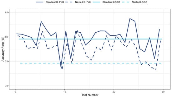 To further assess the differences in performance between the standard and nested versions of K-fold and LOGO CV methods, we conducted 30 trials focusing on the RF classifier. Each trial involved shuffling the observations and varying the seed parameter for the K-fold method. However, group randomization or shuffling was deemed unnecessary for the LOGO CV, as all observations were included in the analysis irrespective of their order. This characteristic of LOGO CV resulted in consistent performance across all trials, reflected by a flat line in Figure 7. Hyperparameter selection for the nested CV methods employed GridSearchCV within the inner loops, whereas standard CV methods utilized it in the main loops. Subsequently, the identified optimal hyperparameters were used to train the model on the training set. Notably, the standard (non-nested) implementations of both K-fold and LOGO CV generally achieved higher accuracy rates compared to their respective nested counterparts. Furthermore, the K-fold methods consistently outperformed the LOGO methods in terms of accuracy.