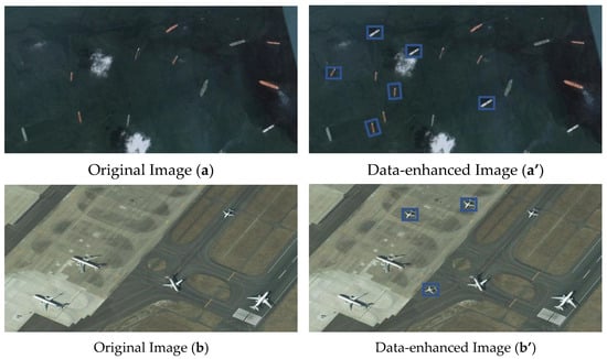 In addition to the data augmentation methods adopted by YOLOv7, this paper also utilizes small target replication for data expansion, targeting the lesser number of small target samples in the dataset. Within an image, multiple small targets (based on the small target criteria defined by COCO) are randomly selected for replication and placed at random positions. Simultaneously, small objects are randomly replicated three times. This method helps increase the occurrence frequency of small targets, thereby improving the model’s ability to recognize these targets. The enhancement effect is illustrated in Figure 1. In order to clearly observe the data location of the additional items, the author added a blue box.