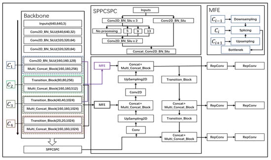 C1, C2, C3, and C4 are four modules divided according to the original backbone network, with their features extracted and then subjected to multi-scale feature fusion on the basis of the original network. By inputting the features from the C1, C2, and C3 modules into our designed MFE module, they are fused into a new feature. Similarly, the features from the C2, C3, and C4 modules are also fused into another new feature. The working principle of the MFE module involves the use of max pooling for downsampling and nearest-neighbor interpolation for upsampling. The detailed network structure is illustrated in Figure 2.