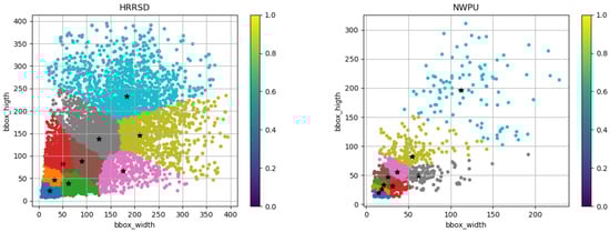 K-means clustering with Larger k; TGRS-HRRSD-Dataset is on the left and NWPU VHR-10 Dataset is on the right. In the image, each target frame is classified to the nearest cluster center, marked with a different color, and the cluster center is marked with a large asterisk. This can visually display the clustering of target boxes.