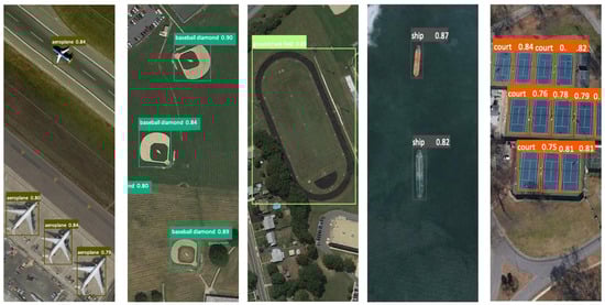 In the field of remote sensing images, traditional target detection algorithms based on manually designed features are similar to those used in conventional images. The traditional target detection process involves candidate region extraction, feature extraction, classifier design, and post-processing. Initially, potential target regions are extracted from the input image using candidate region extraction methods. Subsequently, features are extracted for each region, followed by classification based on the extracted features. Finally, post-processing filters and merges the obtained candidate boxes to produce the final results. Commonly used features in remote sensing target detection include color features [,], texture features [], edge shape features [], and contextual information. Since a single feature may not adequately represent the characteristics of the target, multiple-feature fusion is often employed. Remote sensing image processing based on neural networks is mostly transplanted from algorithms in the natural image processing domain and then optimized for the characteristics of remote sensing images. The target detection task based on deep learning directly employs convolutional neural networks to complete the process, including feature extraction, multi-category classification of targets, and target localization. It can handle and obtain primary texture and high-level semantic features of images. Through training and learning with large amounts of data, it automatically completes the target detection task, without the need for manual processing of massive amounts of data. With the continuous development of remote sensing technology and the popularization of low-altitude unmanned aerial vehicles, remote sensing image acquisition has become more convenient and efficient.