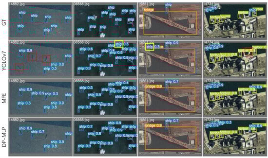 Comparison of detection performance based on the TGRS-HRRSD Dataset. In the figure, GT denotes ground truth labels, while YOLOv7/MFE/DP-MLP represents the three comparison models. The red boxes indicate missed detection annotations and the yellow boxes denote false detection annotations.