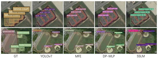 Comparison of detection performance based on the NWPU VHR-10 dataset. In the figure, GT denotes ground truth labels, while YOLOv7/MFE/DP-MLP/SSLM represents the three comparison models.