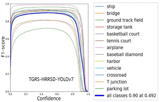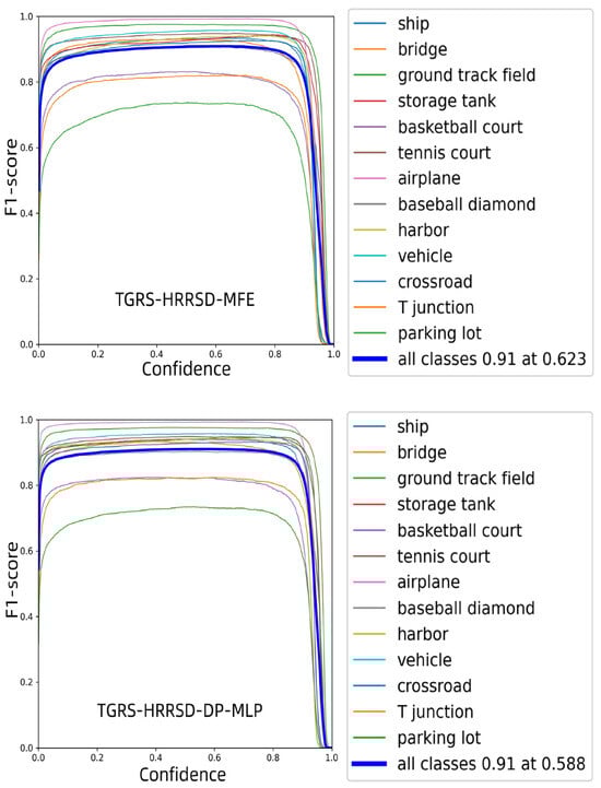 Figure 12 shows the performance of three different models: YOLOv7, MFE, and DP-MLP in detecting different categories of targets in the TGRS-HRRSD-Dataset. The F1 score serves as a measure of model performance, taking into account both precision and recall. In these plots, the x-axis represents confidence, while the y-axis represents the F1 score.