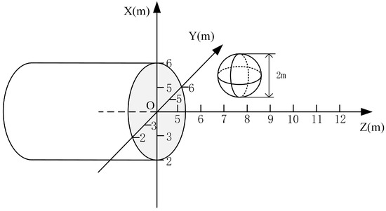 A three-dimensional geoelectric field finite-element model of the tunnel was established to analyze and study the different electrode array arrangements. The entire model is designed to be 12 m × 8 m × 8 m. The TBM model and the excavation tunnel are set as a whole, with a length of and a radius of 1 m. A high-resistance ball with a radius of 1 m is set on the upper-right side in front of the tunnel face. The X-axis denotes the height, the Y-axis denotes the width, and the Z-axis denotes the direction of the tunnel excavation, and the location schematic is shown in Figure 3.