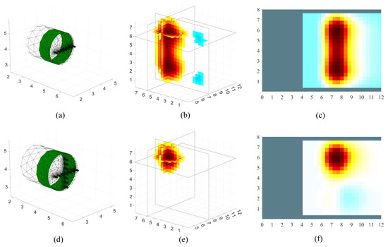 Different electrode array arrangements and reconstruction results. (a,d) are the one-line electrode array arrangement and the cross-shaped electrode array arrangement; (b,e) are the three-dimensional reconstruction results; (c,f) are the two-dimensional slices along the Y-axis direction past the center of the high-resistance sphere.