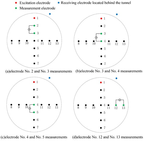 The measurement strategy of the electrode array determines to a certain extent the quality of the image reconstruction. Common measurement methods principally include adjacent excitation adjacent measurement, interval excitation adjacent measurement, relative excitation adjacent measurement, etc. The main difference between these measurement methods lies in the selection of the excitation electrode pair and the measurement electrode pair. Based on the adjacent-excitation–adjacent-measurement method, this study proposes a measurement method suitable for the cutterhead-source electrode array, as shown in Figure 5. Each electrode in the electrode array serves as both an excitation electrode and a measurement electrode. When beginning the measurement process, electrode No. 1 and the receiving electrode located behind the tunnel are the excitation electrodes, and the remaining electrodes are the measurement electrodes. The rules are as follows: First, the No. 1 electrode is used for excitation, and the adjacent No. 2 and No. 3 electrodes perform the potential measurement. Then, the No. 3 and No. 4 electrodes perform measurements until the No. 12 and No. 13 electrodes complete the measurement. At this point, the potential measurement work of electrode No. 1 for excitation is completed. Then, electrode No. 2 is used for excitation, and electrodes No. 3 and 4 start measuring, until electrodes No. 13 and No. 1 finish the measuring. Finally, analogously, electrode No. 13 starts excitation, electrodes No. 1 and 2 begin to measure, until electrodes No. 11 and 12 finish measuring, and the measurement of the entire electrode array is completed. It should be noted that electrode No. 4 located in the center of the electrode array does not perform a repeated role in the excitation and measurement processes.