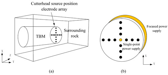 The established geoelectrical model is shown in Figure 6a. The dimensions are consistent with the simulation model established in Section 2.4; additionally, the electrodes are regarded as point electrodes because of their extremely small dimensions with respect to the tunnel-boring machine. As shown in Figure 6b, in the case of a single-point power supply, the electrode at the center of the electrode array is set as the supply electrode, and the supply current is 1A; in the case of a focusing power supply, in addition to the supply electrode at the center position, another circle of focusing electrodes is arranged at the front edge of the TBM shield, and the current size is also 1A. The other electrodes in the electrode array, except for the supply electrode, are used as the measurement electrodes, and the background resistivity of the surrounding rock is set to be 1000 Ω·m.