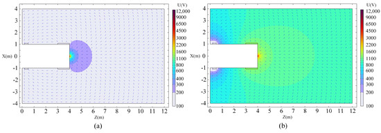 The characteristics of the electric field in the detection area in front of the shield-tunnel face are analyzed, including an electric field distribution map and a potential distribution cloud map. The E-field distribution map can clearly show the relationship between the E-field strength and the depth change under two different modes of single-point power supply and focused power supply, while the potential distribution cloud map reflects the level of electric potential, and the direction and length of the arrows in the map indicate the direction and size of the current, respectively. The slicing operation is performed at Y = 0 m, and the electric field distribution map is obtained, as shown in Figure 7.