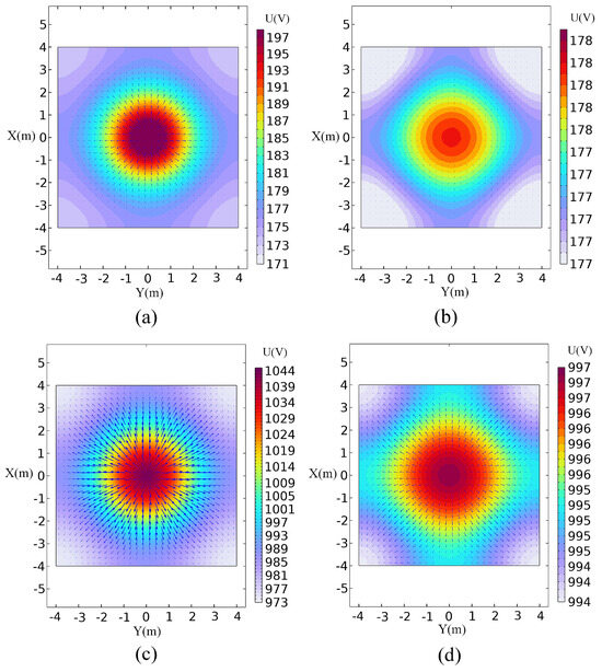 Potential slice diagram. (a) The single-point power supply Z = 6 m; (b) The single-point power supply Z = 10 m; (c) The focused power supply Z = 6 m; (d) The focused power supply Z = 10 m.